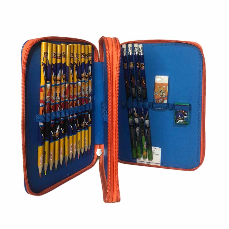 Incluye 12 Lapices de colores, 4 negros, goma de borrar y sacapuntas.